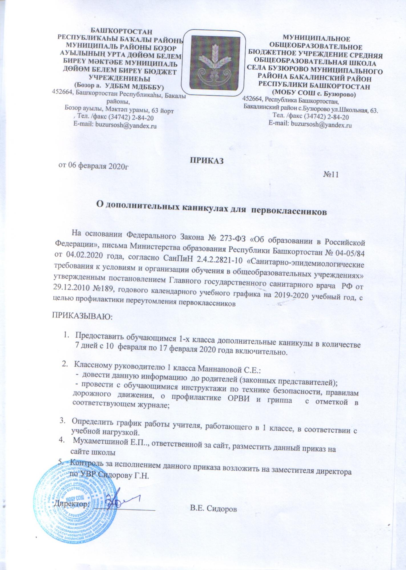Приказ о дополнительных каникулах для первоклассников.