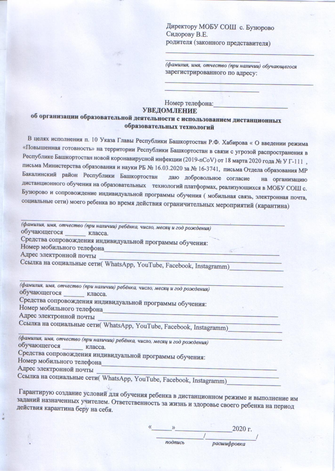 уведомление родителям о временном переходе на ДОТ